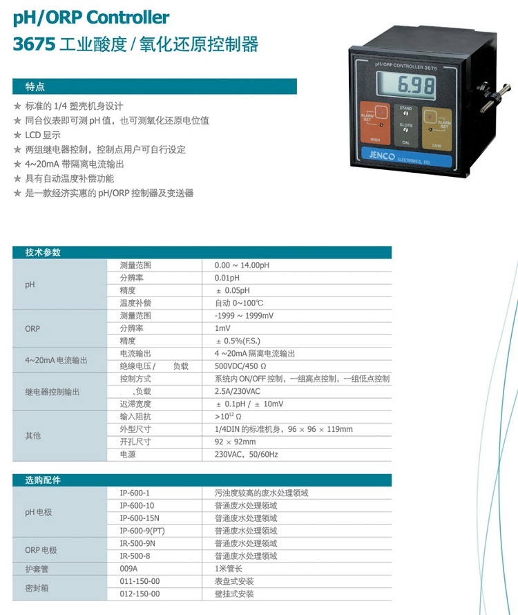 繼電器熱電隅pH/ORP±0.1 ph /±10 mV