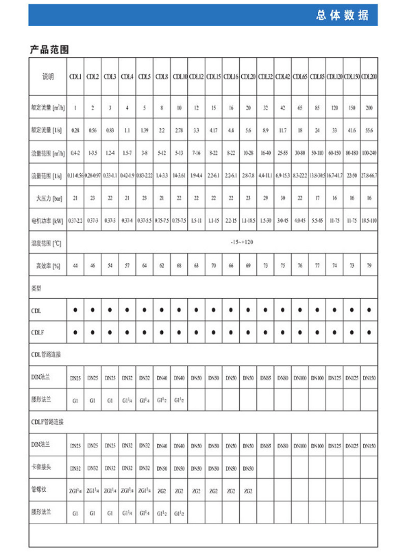 南方CDL,CDLF非自吸輕型立式多級離心泵,電機軸通過聯軸器直接與泵軸聯接,葉輪導葉采用不銹鋼板沖壓焊接或不銹鋼精密鑄造制成,泵進出水口在泵底同一直線上(可配IEC或NEMA電機)。