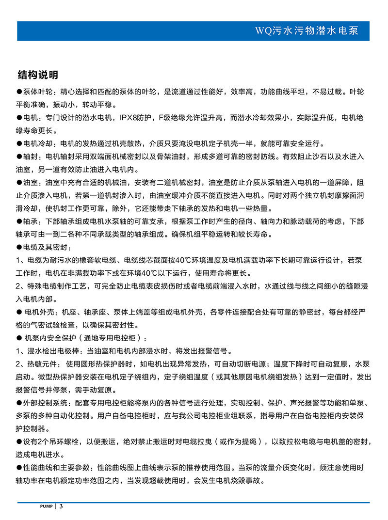 產(chǎn)品說(shuō)明:南方WQ污水污物潛水電泵由電機(jī)與泵兩部分組成,兩者通過(guò)油室及機(jī)械密封組件隔開(kāi),分固定式自動(dòng)耦合安裝和移動(dòng)安裝。