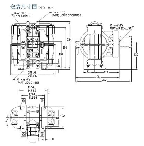 接液部和外壓板材質(zhì):不銹鋼 空氣腔:聚丙烯 中間體:聚丙烯 隔膜材質(zhì):特氟隆帶氯丁橡膠背膜(白色)