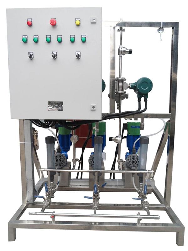 配置:該加藥裝置由計量泵、控制系統、流量計、變頻器、標定柱、背壓閥、安全閥和不銹鋼管道組成。