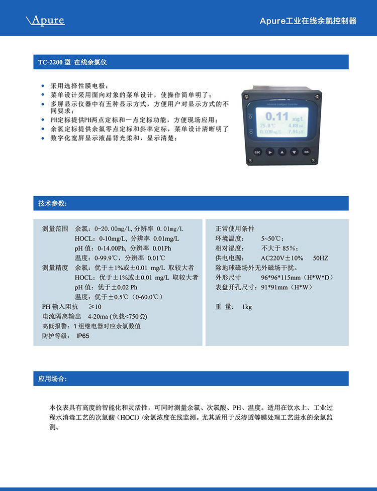 Apure余氯儀TC-2200標配工程在線極譜式余氯溫度PH測量控制器