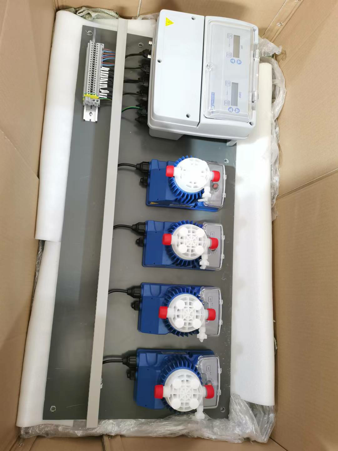 三臺(tái)或者四臺(tái)加藥計(jì)量泵可選,投加絮凝劑計(jì)量泵, 加酸計(jì)量泵,加氯計(jì)量泵和除藻劑加藥泵。